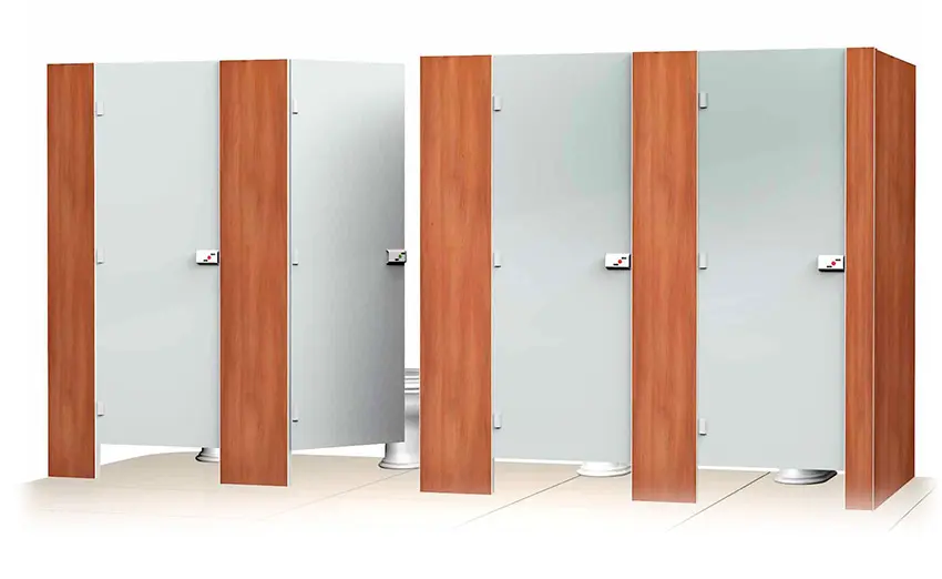 Divisória sanitária com painéis frontais duplos, oferecendo um acabamento elegante tanto na parte interna quanto externa. Sistema autoportante, sem necessidade de barra superior de travamento.